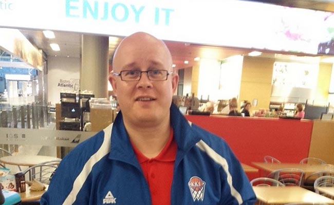 Mynd/ VÖH: Ingi Þór þjálfari U15 ára drengjalandsliðsins aðeins mínútum áður en hann lagði land undir fót og hélt með 15 ára liðið til Kaupmannahafnar. Hann ætlar eins og stendur í auglýsingunni fyrir ofan hann, að „njóta þess“ að vera ytra með landsliðunum.