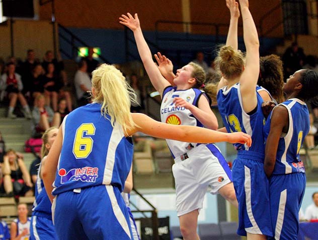 Mynd/ Margrét Rósa Hálfdánardóttir umkringd fjórum varnarmönnum Svía. Margrét Rósa varð 17 ára gömul í dag og óskar Karfan.is henni innilega til hamingju með dagin.
