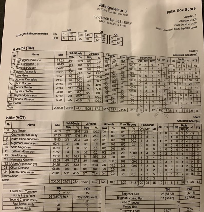 Stigahæstir fyrir Tindastól í leiknum voru Dedrick Basile og Ioannis Agravanis með 16 stig hvor. Þá skilaði Davis Geks 14 stigum. Fyrir Hött var Nemanja Knezevic stigahæstur með 15 stig og honum næstir voru Adam Eiður Ásgeirsson og Courvosier Mccauley með 11 stig hvor.
