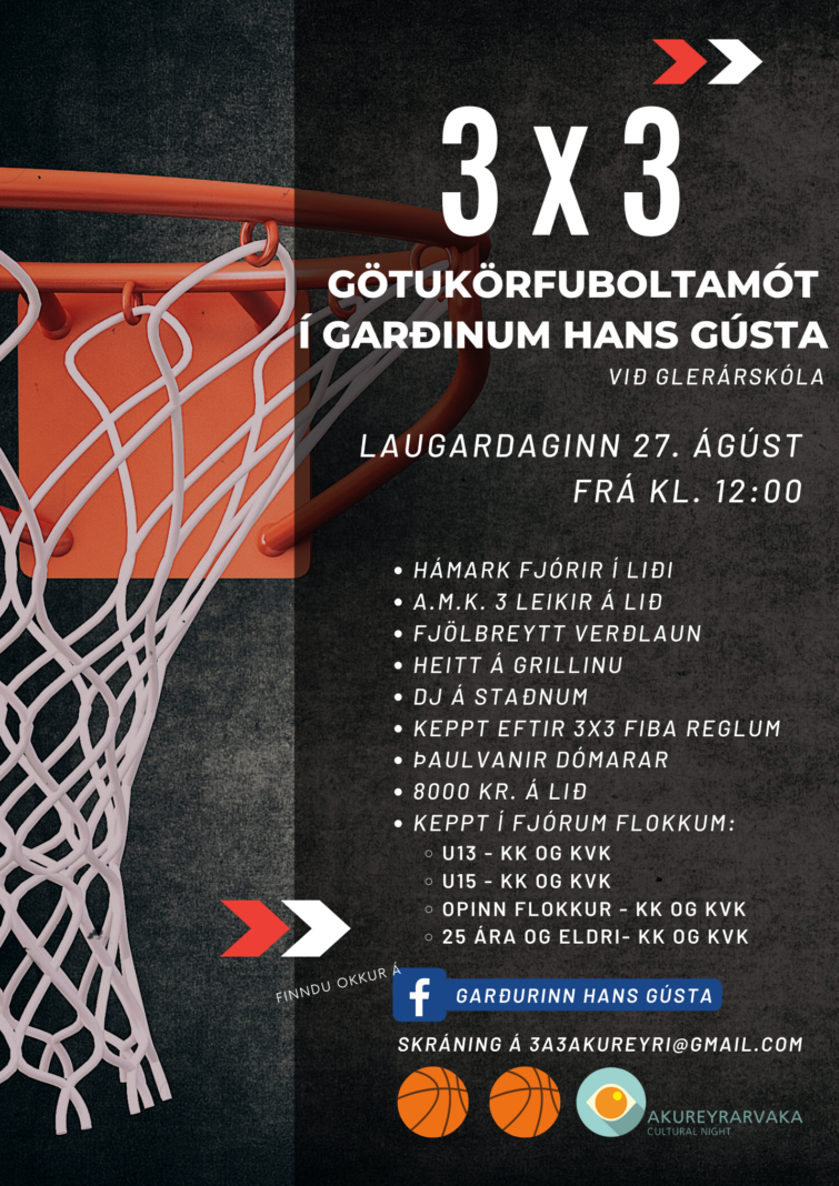 Laugardaginn 27. ágúst verður 3 á 3 Götukörfuboltamót haldið í Garðinum hans Gústa – glæsilegasta útikörfuboltavelli landsins – við Glerárskóla. Mótið er haldið í tengslum við Akureyrarvöku og verður völlurinn vígður formlega við sama tilefni.