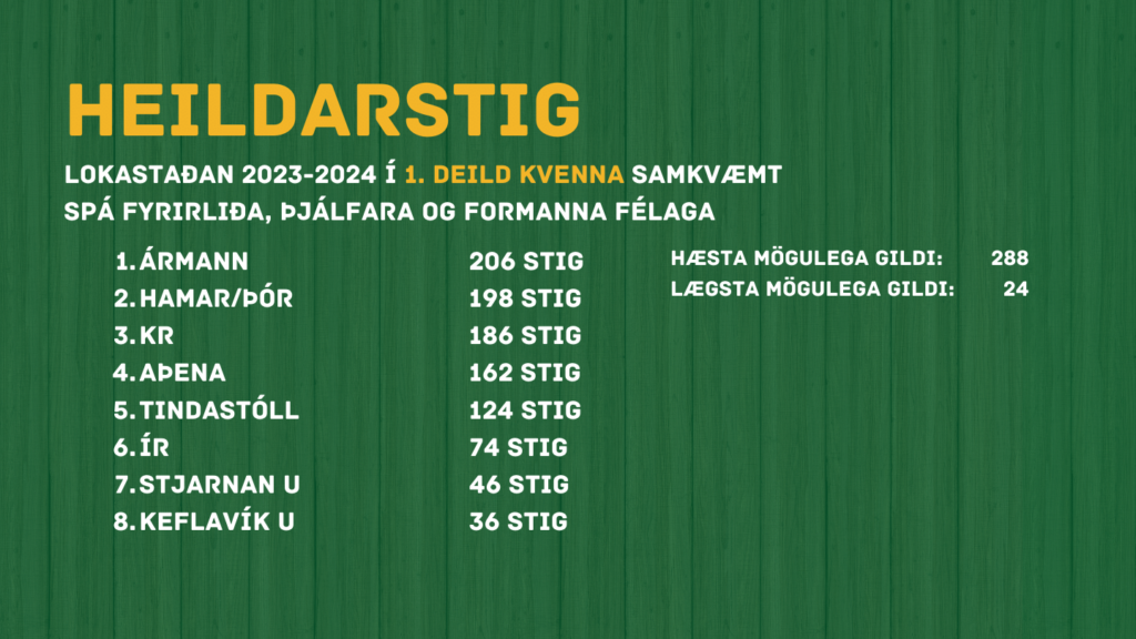 Hér fyrir neðan má sjá spár formanna, þjálfara og fyrirliða liða og spá fjölmiðla fyrir fyrstu deild kvenna sem opiberaðar voru á árlegum kynningarfundi nú í hádeginu.