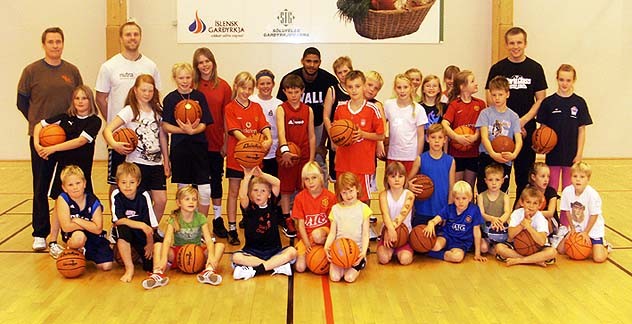 Sveinbjörn Claessen og Vilhjálmur Steinarsson stjórnuðu æfingunni af miklum myndarskap en féllu smá í skuggan þegar leikmaður ÍR ættaður frá Bandaríkjunum kom í heimsókn, Kelly Beidler. Þótti krökkunum mikið til hans koma. Með fylgjandi mynd tók Árni Þór Hilmarsson íþróttakennari og körfuboltagúru ættaður frá Syðra-Langholti.