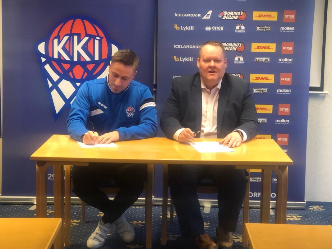 Benedikt og Hannes S. Jónsson formaður KKÍ handsöluðu samninginn nú í hádeginu. Samningur Benedikts er til fjögurra ára eða út undankeppni HM 2023. Ekki hefur verið gengið frá ráðningu aðstoðarþjálfara liðsins.