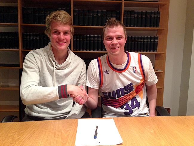 Mynd/ SC: Björgvin og Elvar Guðmundsson formaður ÍR á skrifstofum Landslaga í gærkvöldi.