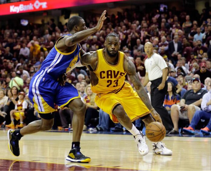 James og félagar léku á alls oddi. Hvort sem það voru þristar um allan völl eða háloftatroðslur – allt fór að þeirra óskum. Cavs náðu um 20 stiga mun þegar Warriors fóru að bíta loks frá sér með sóknarleik sem er þeim að skapi og gerði þá að deildarmeisturum í vetur. Það var aðeins of lítið og allt of seint.