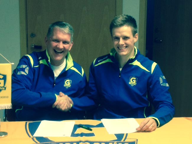 Mynd/ Jón Gauti og Daníel handsala málin og verður ekki annað séð en að formaðurinn sé himinlifandi með að Daníel hafi ákveðið að framlengja. Eins af gefnu tilefni skal það tekið fram að Daníel er á 28. aldursári og með reynslumeiri bakvörðum deildarinnar.