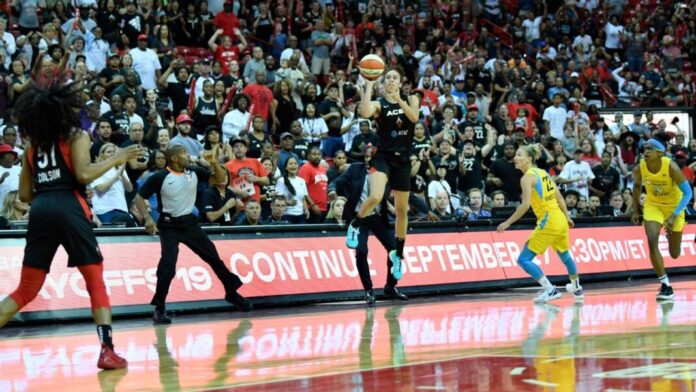 Litlu munaði að Dearica Hamby yrði skúrkurinn í leik Las Vegas Aces og Chicago Sky í 2. umferð úrslitakeppni WNBA í gær.