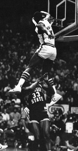 Það þekkja sennilega fæstir Dirk Minnefield en hann átti eina mögnuðustu troðslu sem fest hefur verið að filmu á níunda áratugnum. Minnefield var 190 cm bakvörður hjá Kentucky háskólanum þegar ósköpin dundu yfir í leik gegn Mississippi State.