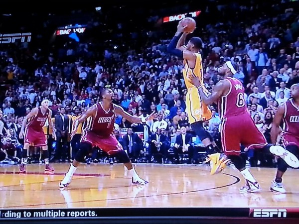 Þegar 10 sekúndur voru eftir af þessum leik höfðu Pacers boltann og voru þremur stigum undir. George tekst að losa sig við LeBron með góðri gabbhreyfingu en LeBron virðist snerta George full mikið í lokaskotinu. George kvartar skiljanlega og heimtar þrjú víti en fær ekkert.