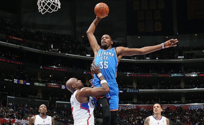 Átta leikir fóru fram í NBA deildinni í nótt. Kevin Durant bauð upp á glæsilega þrennu í sigri Oklahoma, Indiana mátti þola ósigur gegn Denver sem léku án Stephen Jackson og Portland lagði Minnesota.