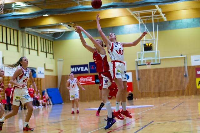 Valsstúlkur pressuðu allan völlinn strax í öðrum hluta og settu leikinn í sínar hendur með 15-0 kafla og forystuna 21-30 og refsuðu Snæfelli illa fyrir að vera óöruggar á boltanum og missa hann trekk í trekk. Snæfellingar bættu þá verulega í vörn og báráttu um fráköstin og náðu að krafsa sig nær 29-33 og funheitt orðið í húsinu. Staðan 39-42 fyrir Val í hálfleik og engin merki uppi um eitt eða neitt nema baráttuleik.