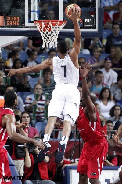 Mynd: Russell Westbrook var sjóðandi í nótt með 38 stig í þríframlengdum leik New Jersey og Oklahoma.