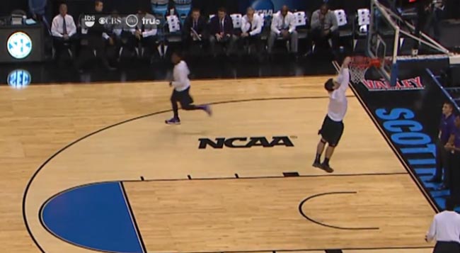 Marsfárið er í fullum gangi og Kentucky háskólinn er kominn í 8-liða úrslit í miðvesturriðlinum eftir 56-49 sigur á Kansas State. Leikurinn hófst 1-0 fyrir Kentucky eftir að lygilegu regluverki hafði verið framfylgt. Í NCAA háskólaboltanum er nefninlega bannað að troða boltanum þegar 20 mínútur eða minna eru eftir af upphitun fyrir leik!