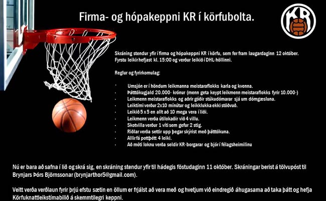 Skráning stendur yfir í firma og hópakeppni KR körfu en hún mun fara fram laugardaginn 12. október næstkomandi. Fyrstu leikir hefjast klukkan 15:00 og verður spilað í DHL-Höllinni.