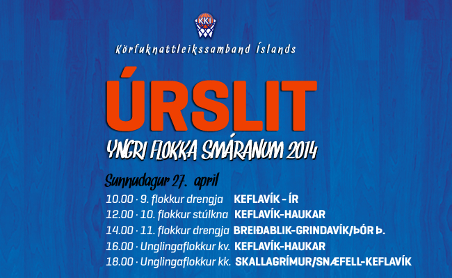 Úrslit yngri flokka halda áfram í Smáranum í Kópavogi í dag. Alls eru fimm úrslitaleikir á dagskránni og hefst dagurinn á úrslitaleik Keflavíkur og ÍR í 9. flokki drengja kl. 10:00.