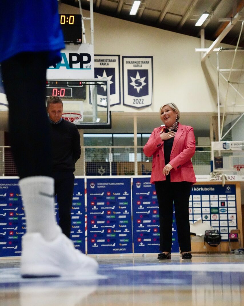 Undir loka heimsóknarinnar ávarpaði Halla alla leikmenn og starfslið liðsins. Stappaði hún þar stálinu í liðið og nefndi að mögulega væru íslendingar bestir þegar á brattan væri að sækja. Þá nefndi hún sameiningarmátt körfubolta og benti á hversu mikið Grindvíkingar hefðu hallað sér að íþróttinni þegar náttúruhamfarir dundu á heimabyggð þeirra fyrir tveimur árum. Undir lokin sló eiginmaður hennar Björn á létta strengi og benti leikmönnum liðsins á hversu mikilvægt það væri að fylgja á eftir þegar boltanum er skotið.