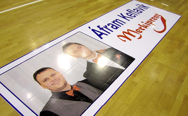Framan við Keflavíkurbekkinn í Laugardalshöll er merkileg auglýsing frá Merkiprent í Reykjanesbæ. Fyrirsæturnar í auglýsingunni eru sjálfir formaðurinn og framkvæmdastjóri Körfuknattleiksdeildar Keflavíkur og eru þetta svona ljómandi myndarlegir menn.