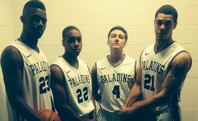 Mynd/ Kristófer Acox lengst til hægri ásamt nokkrum liðsfélögum í Furman skólaliðinu.