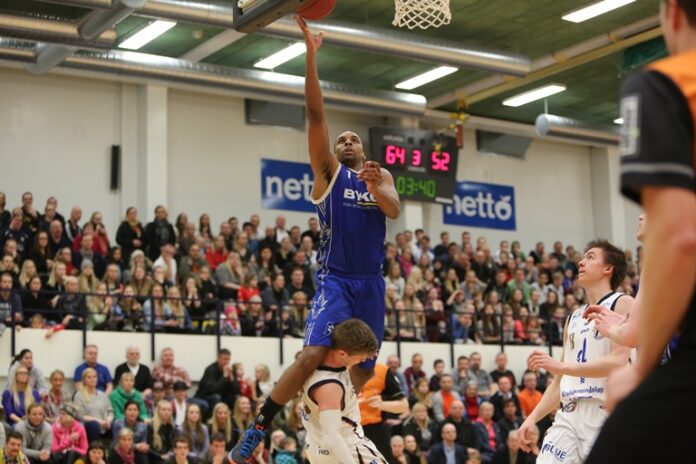 Mynd/ [email protected] – Jarrid Frye ,,klobbar” hér Val Orra Valsson í leik liðanna í gærkvöldi.