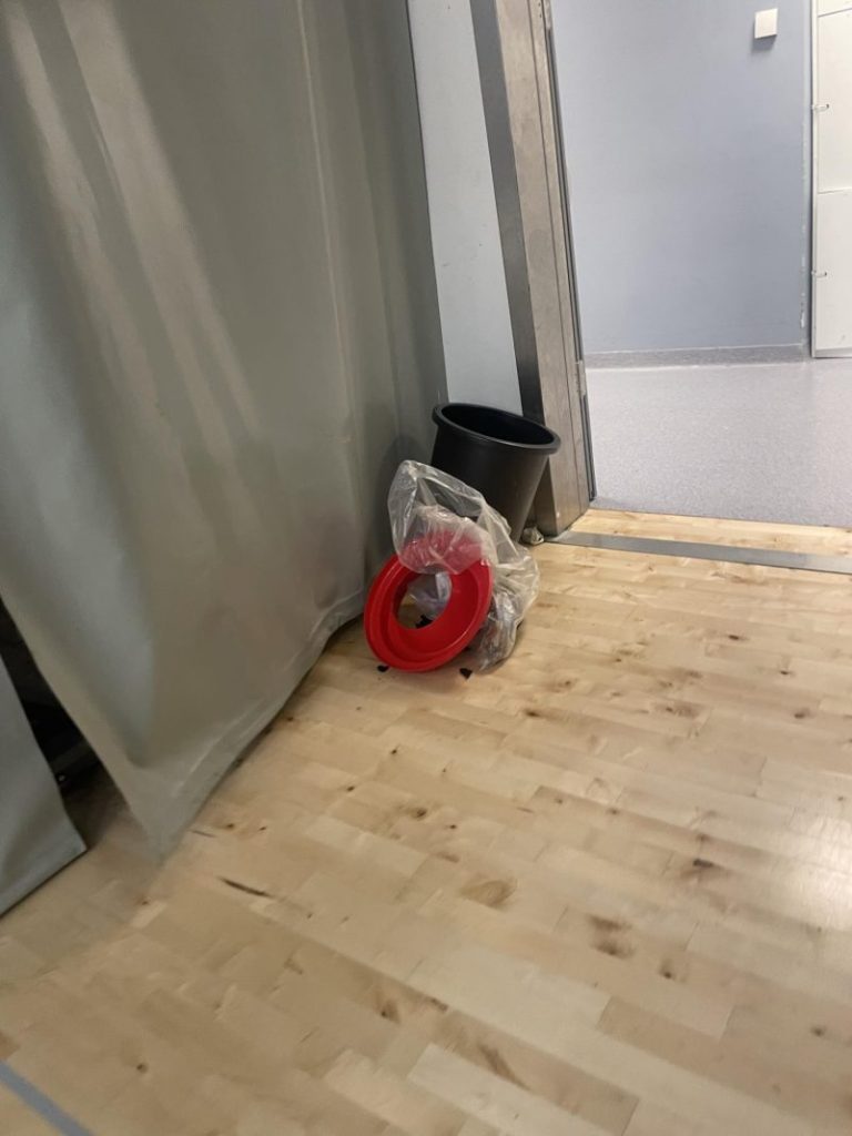 DeAndre brást heldur illa við og eyðilagði meðal annars ruslatunnu á leiðinni sinni út úr húsinu með því að sparka henni í átt að sjálboðaliða við gæslustörf. Hér fyrir neðan má sjá mynd af gjöreyðilagðri 75 lítra ruslatunnunni sem varð á vegi hans til búningsklefa.
