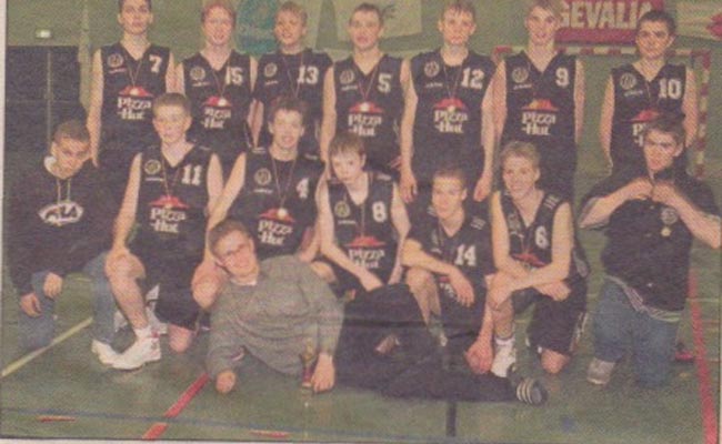 Mynd: Aftari röð frá vinstri: Óskar Arnórsson, Baldur Jónasson, Reynar Bjarnason, Davíð Kristjánsson, Sverrir Gunnarsson, fyrirliði, Jón Arnór Stefánsson og Helgi Magnússon. Fremri röð frá vinstri: Þórlindur Þórólfsson, Hjalti Kristinsson, Andri Fannar Ottósson, Jakob Sigurðarson, Gunnar Örn Arnarson, Björgvin Björnsson, varafyrirliði og Markús Hjaltason. Þjálfari liðsins er svo fremstur og manna kátastur, Ingi Þór Steinþórsson.