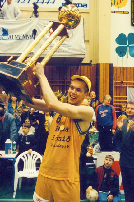Ljósmynd/ www.vf.is – Guðmundur Bragason lyftir Íslandsmeistaratitlinum á loft í Keflavík.