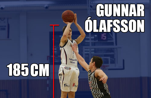 Pavel Ermolinskij er 202 cm á hæð og við sjáum hve hátt fyrir ofan hann Gunnar er. Pavel nær ekki að boltanum með útréttan handlegg, þrátt fyrri alla þessa hæð. Gunnar er hins vegar 185 cm og ef við gefum okkur að hann sé á hæsta punkti þegar þessi mynd er tekin þá er hægt að áætla stökkhæðina út frá myndinni með hliðsjón af hæð Gunnars.