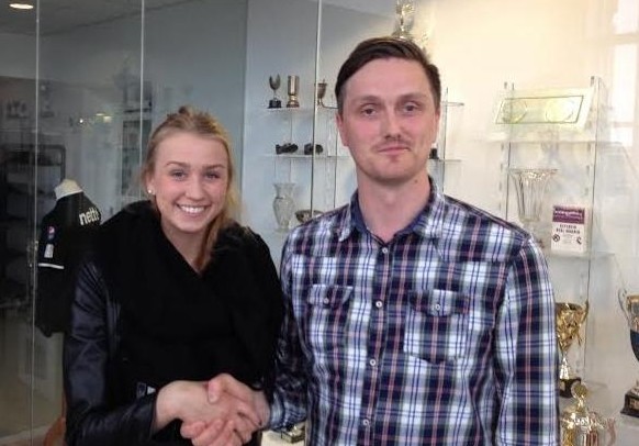 Mynd: Sævar Sævarsson yfir samningatæknir hjá Keflavík handsalar samningi við Hallveig.