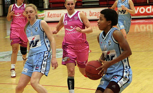 Jaleesa Butler er komin með 8 stig, 8 fráköst og 5 blokkuð skot fyrir Val og Kristrún Sigurjóns 9 stig. Tapaðir boltar eru tvöfallt fleiri hjá Val (14) en hjá Hamri (7) en Íris Ásgeirsdóttir og Di’Amber Johnson eru með 10 stig og Marín Laufey Davíðsdóttir með 8 stig og 7 fráköst.