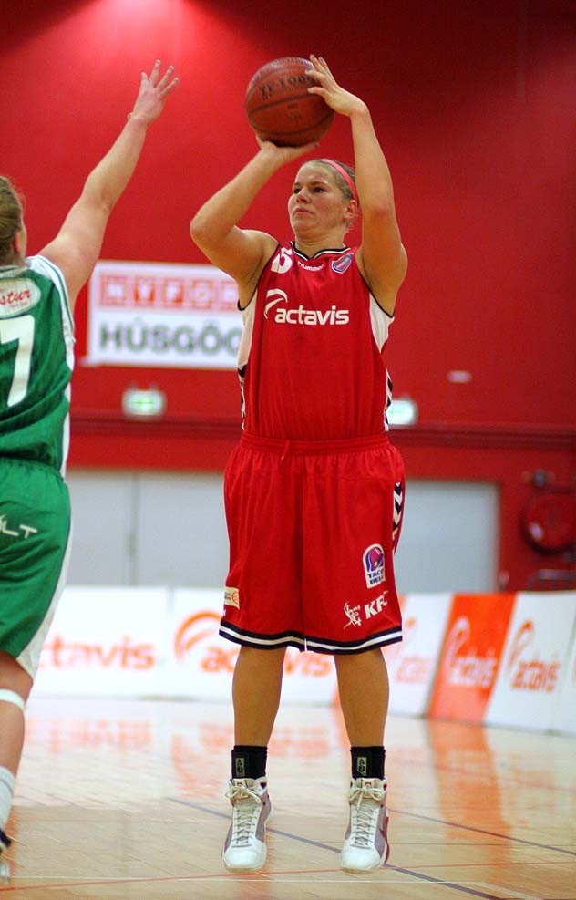 Heather Ezell var af í kvöld með ótrúlega þrennu 40 stig, 13 stoðsendingar og 10 fráköst. En það sem stóð upp úr í leik Hauka var hve margir leikmenn lögðu sitt af mörkum í sókn og vörn en það hefur háð liðinu í vetur hve leikmenn liðsins treysti á að Heather Ezell geri allt. Kiki Lund skoraði 17 stig og Helena Hólm 10.