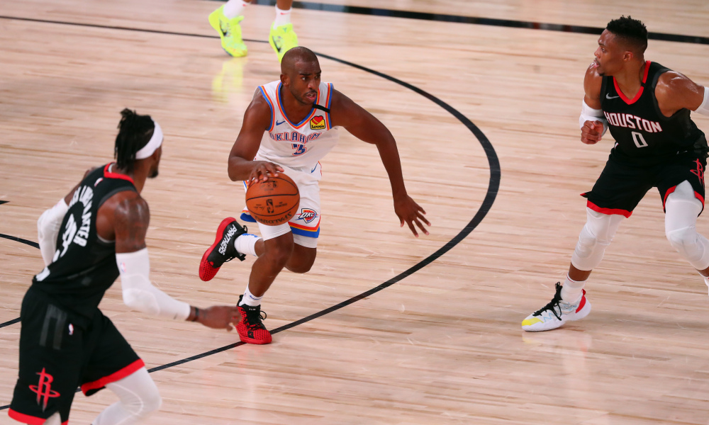 Í seinni leik kvöldsins unnu Houston Rockets sjöunda leik einvígis síns gegn Oklahoma City Thunder í fyrstu umferð úrslitakeppni Vesturstrandarinnar, 104-102. Rockets fara þá áfram og mæta Los Angeles Lakers í annarri umferð. Robert Covington atkvæðamestur fyrir Rockets í leiknum með 21 stig og 10 fráköst. Fyrir Thunder var það Chris Paul sem skilaði þrefaldri tvennu, 19 stigum, 11 fráköstum og 12 stoðsendingum.