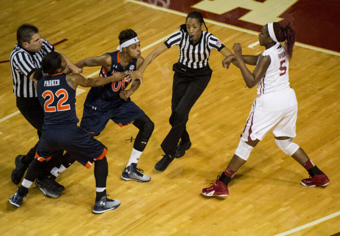 Upp úr sauð þegar Alabama háskólinn mætti Auburn háskólanum í háskólabolta kvenna í gær. Tveir leikmenn sendir í sturtu eftir að hafa skiptst á höggum og sent óvart dómara leiksins í gólfið í látunum.