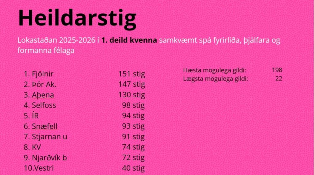 Hér fyrir neðan má sjá spá formanna, þjálfara og fyrirliða liða fyrir fyrstu deild kvenna sem opiberuð var á árlegum kynningarfundi nú í hádeginu.