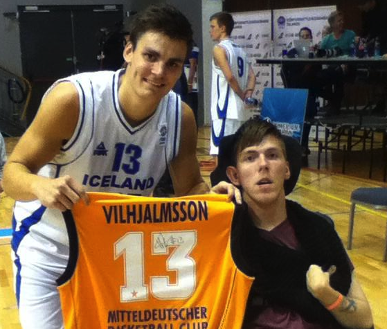 “Ástvaldur skellti sèr í h?llina í kv?ld og horfði á A-Landsliðið taka Breta 83-70 þar horfði hann á sinn uppáhalds leikmann spila H?rð Axel og eftir leik hitti hann Hörður Vilhjálmsson og H?rður færði honum treyju í safnið Ástvaldur gæti ekki verið sáttari með það þúsund þakkir H?rður”