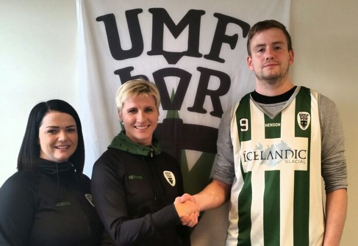 Mynd: Jóhanna Hjartardóttir, formaður Þórs Þorlákshöfn og Hraunar Karl handsala samninginn í dag – Þór Þorlákshöfn.