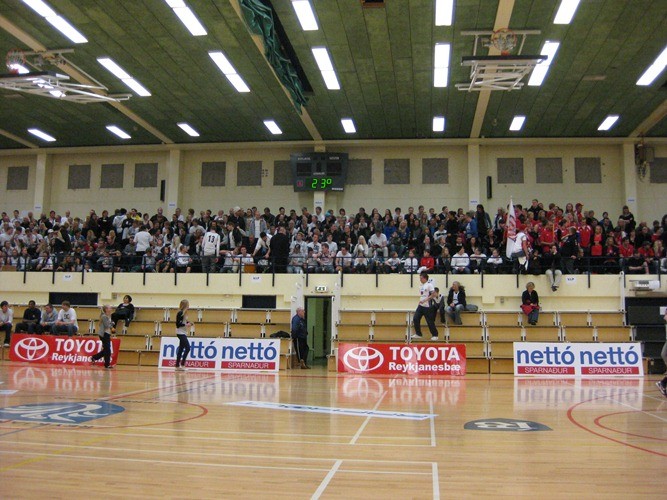 Stúkan í Keflavík lítur nú nánast út eins og Danski fáninn þó svo að skiptingin sé að þeir sem eru í hvítu eru fleiri.