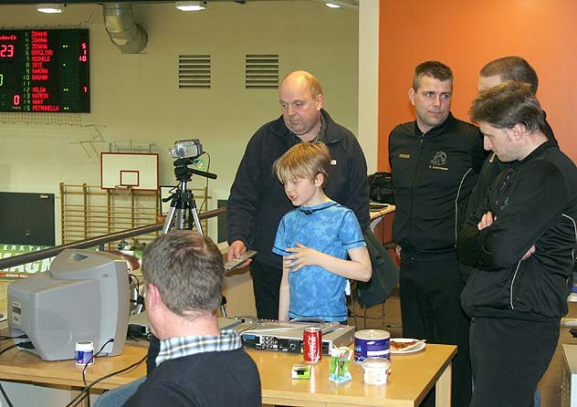 Ljósmynd/ Kristinn og Eggert skoða körfu Grindavíkur á upptökubúnaði þeirra KR-inga í DHL-Höllinni í gærkvöldi.
