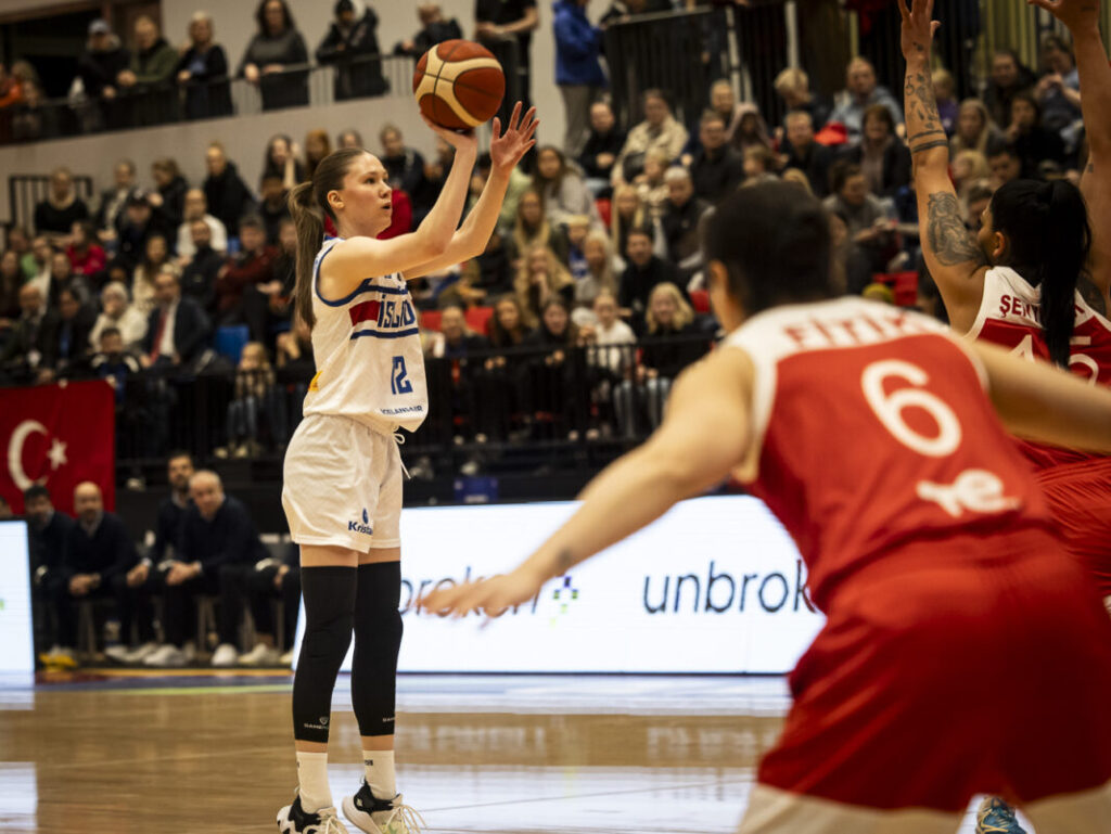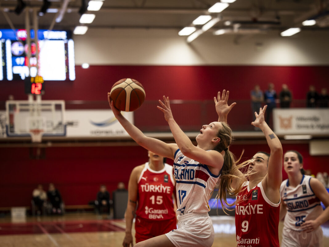 Heimakonur ná áfram að hanga í þeim tyrknesku í upphafi seinni hálfleiksins og eftir glæsilegan flautuflotbolta frá Jönu Falsdóttur eru þær aðeins 7 stigum undir fyrir lokaleikhlutann, 50-57. Áfram heldur Ísland leiknum spennandi inn í fjórða leikhlutann, þar sem aðeins munar 4 stigum á liðunum þegar 6 mínútur eru til leiksloka, 55-59. Á lokamínútunum nær Tyrkland þó aftur að vera þægilegu skrefi á undan og klára leikinn að lokum, 65-72.