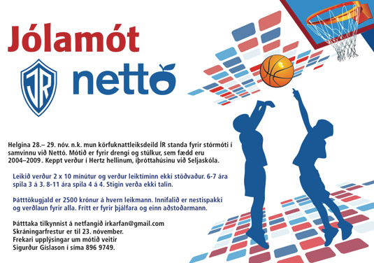 Helgina 28.-29. nóvember næstkomandi stendur Körfuknattleiksdeild ÍR að Jólamóti Nettó í íþróttahósinu við Seljaskóla. Leikið verður 2×10 mínútur þar sem 6-7 ára spila 3 á 3 og 8-11 ára spila 4 á 4. Stig verða ekki talin.