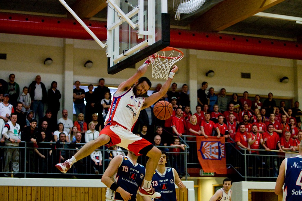 Ljósmynd/ Þorsteinn Eyþórsson: Hlynur Bæringsson reynir á burðarþolið á körfunni í Hólminum.