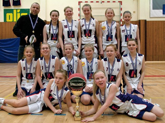 Ljósmynd/ KKÍ – Sigurlið Keflavíkur ásamt þjálfara sínum og dómara, Jóni Guðmundssyni.