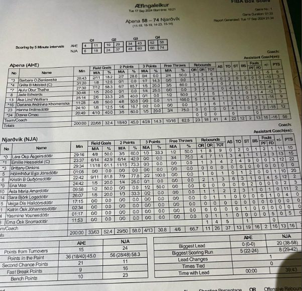 Stigahæst fyrir Njarðvík í leiknum var Brittany Dinkins með 22 stig. Henni næst var Kristín Guðjónsdóttir með 20 stig. Fyrir Aþenu var Ajulu Thatha stigahæst með 18 stig og Dzana Crnac bætti við 12 stigum.