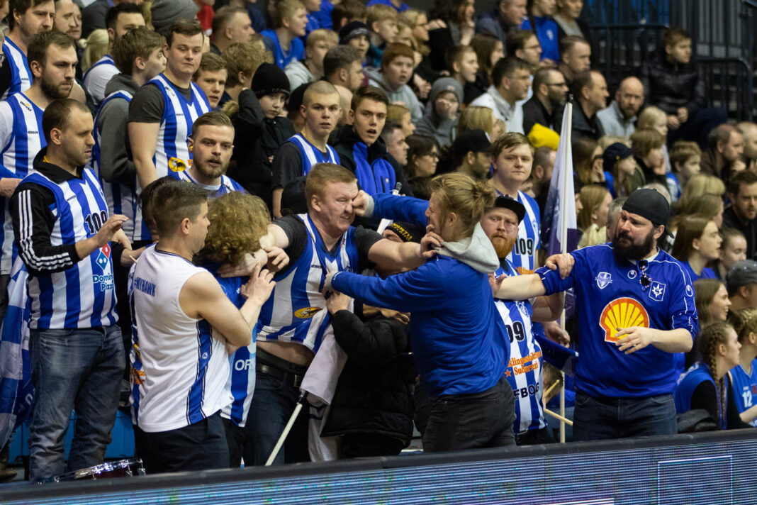 Til handalögmála kom þegar tvær mínútur voru liðnar þar sem hnefar flugu. Það stóð þó stutt yfir og ákváðu stuðningsmenn að einbeita sér að leiknum eftir það. Ljósmyndari Körfunnar, Bára Dröfn náði ótrúlegri mynd af þessi atviki sem sjá má hér að neðan: