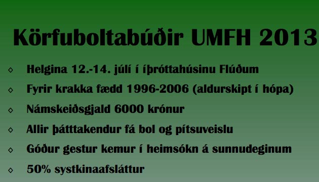 Helgina 12.-14. júlí næstkomandi fara fram Körfuboltabúðir UMFH að íþróttahúsinu Flúðum en námskeiðið er fyrir börn fædd 1996-2006. Allir þátttakendur fá bol og svo verður búðunum lokað með flatbökuveislu.