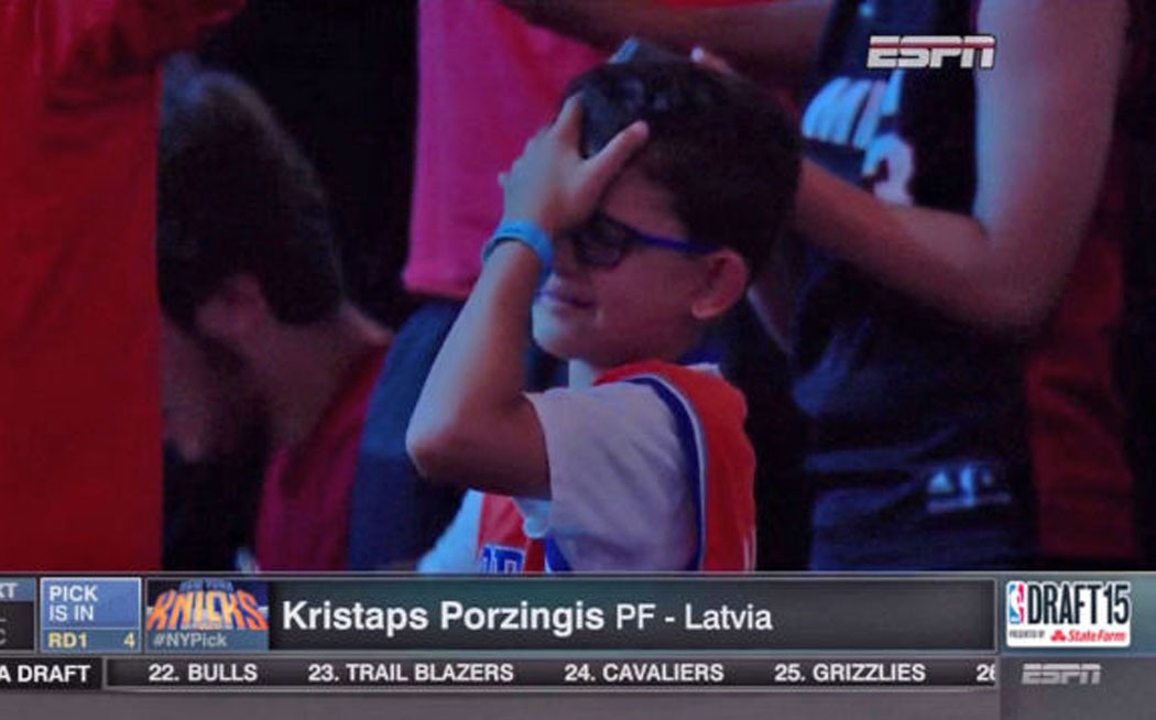 Það kom víst einhverjum á óvart þegar að lið New York Knicks valdi Kristaps Porzingis með fjórða valrétti nýliðavals NBA deildarinnar í fyrra. Margir aðdáenda liðsins létu hátt í sér heyra, en enginn virtist þó meira sorgmæddur en einn lítill strákur sem að var viðstaddur valið.