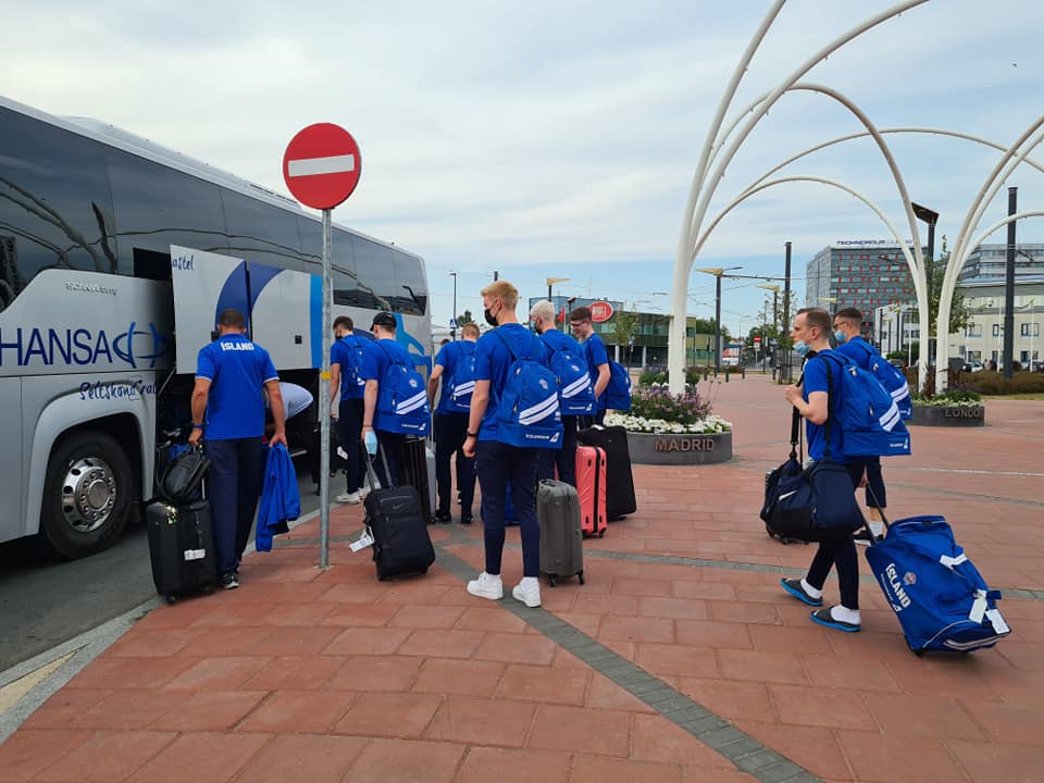 Íslenska landsliðið leikur vináttuleik gegn Eistlandi í dag í undrbúningi sínum fyrir stóran landsleikjaglugga síðar í sumar. Fjórtán leikmenn og fylgdarlið flugu til Eistlands í gær og fengu góðar móttökur samkvæmt fararstjórum.