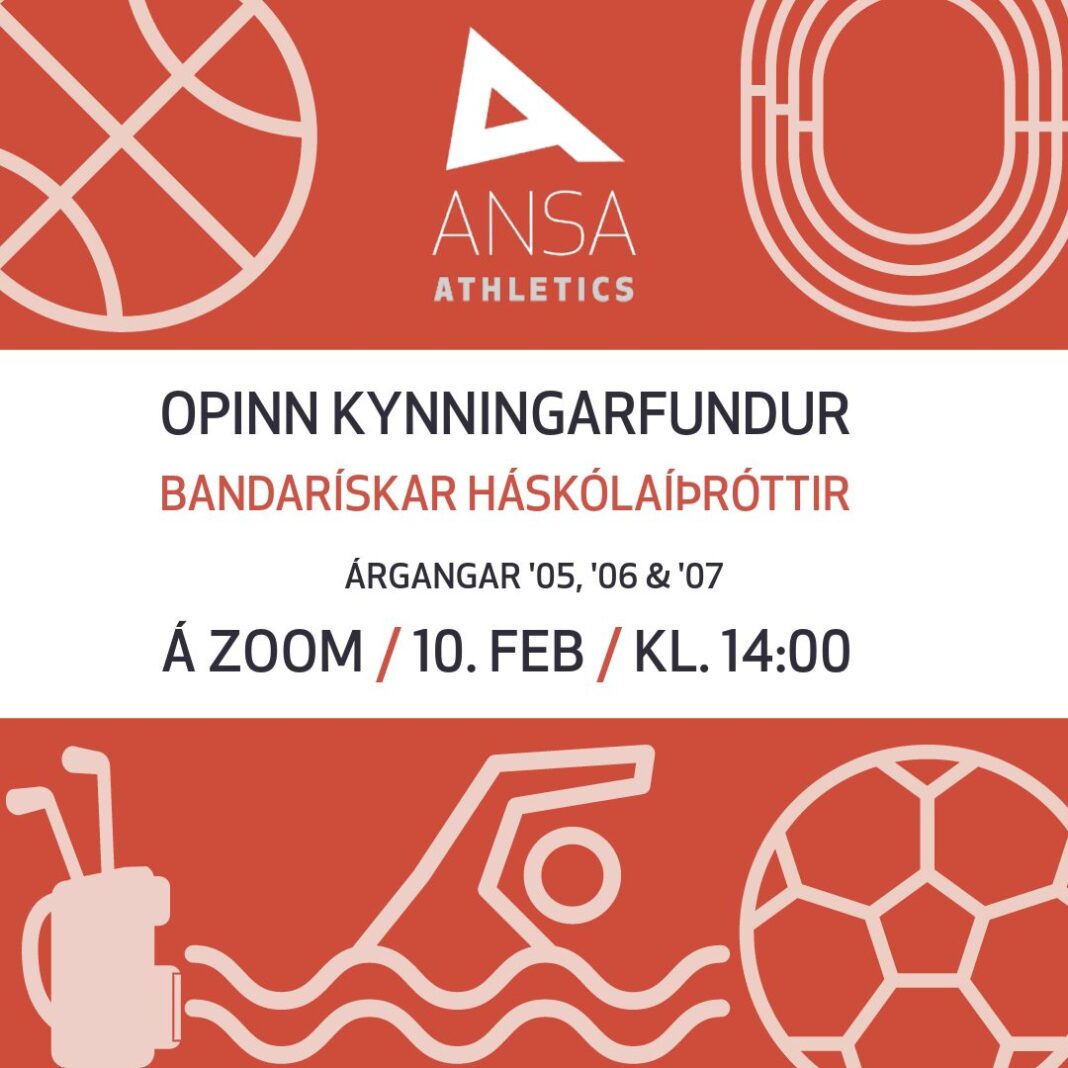 ANSAathletics stendur fyrir fjar-kynningarfundi næstkomandi laugardag, 10. febrúar klukkan 14:00 á Zoom fyrir þá sem hafa áhuga að kynna sér bandaríska háskólaumhverfið betur og möguleikana á námsstyrk. 16-19 ára íþróttaungmenni eru sérstaklega velkomin ásamt forráðamönnum.