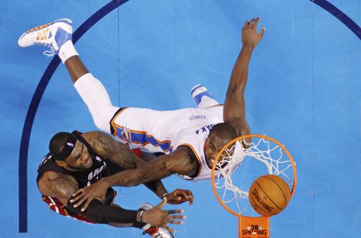 Miami Heat unnu sannfærandi sigur á Oklahoma City Thunder í gærkvöld þar sem þruman gat gersamlega ekki neitt. 2/20 í þristum segir nánast alla söguna. LeBron James fór hamförum í leiknum, skoraði 14 stig á fyrstu 5 mínútum leiksins. Durant og hvaða fleki sem settur var á hann, réðu ekkert við hann í þessum ham. Serge Ibaka reyndi að berja hann til hlíðni en uppskar bara troðslu í andlitið. Það fossblæddi úr trýninu á LeBron… hann er þá mennskur eftir allt.