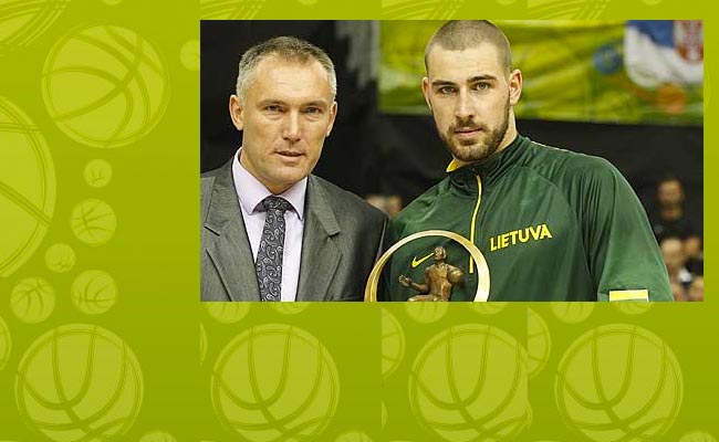 Mynd/ Fyrir viðureign Litháa og Serba í gær fékk Jonas Valanciunas afhent verðlaun frá FIBA Europe sem besti ungi leikmaðurinn í Evrópu. Þetta var annað árið í röð sem hann hlýtur þessa nafnbót.