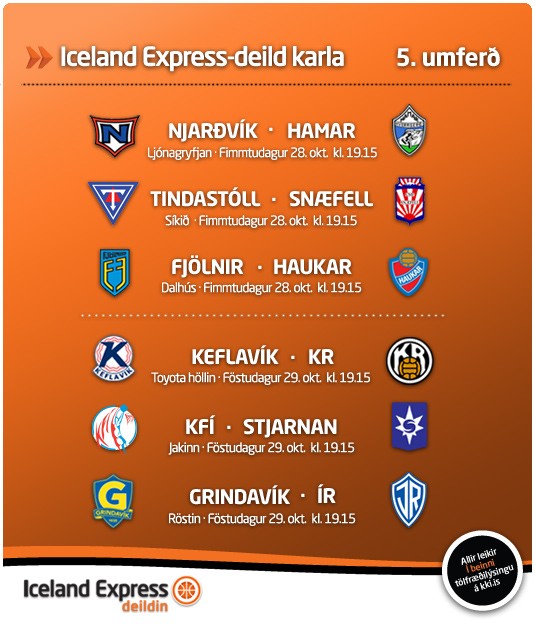 Körfuknattleiksáhugafólki þarf ekki að leiðast í kvöld enda fjöldi leikja í boði. Hæst ber að fimmtu umferð í Iceland Express deild karla lýkur með þremur leikjum sem allir hefjast kl. 19:15. Einnig verður leikið í 1. deild karla sem og í 9. flokki karla og kvenna. Þá verða Frónverjar einnig í eldlínunni í sænsku úrvalsdeildinni.